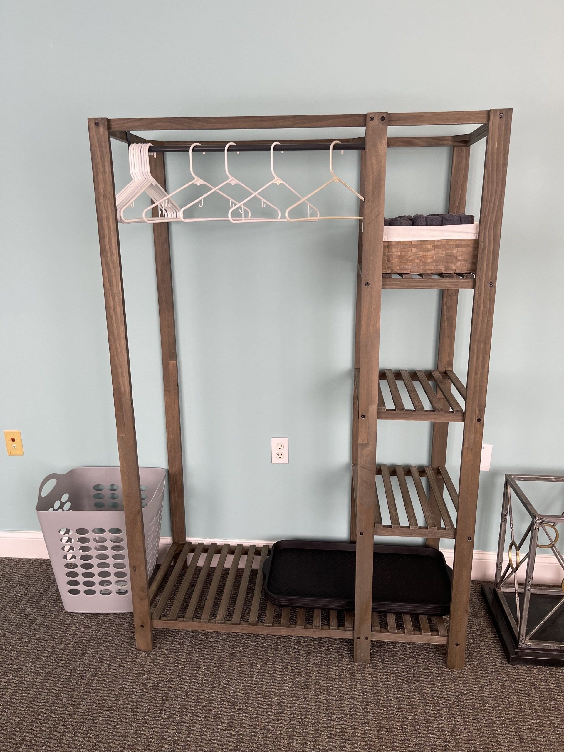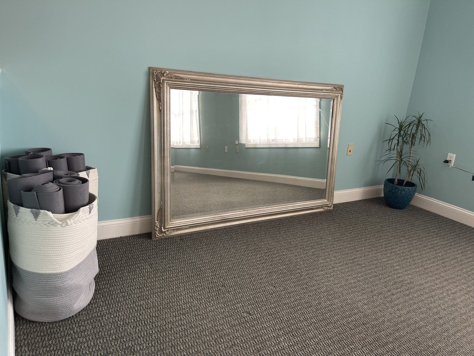 ButtonThe spare yoga mats are housed in two beautiful woven baskets. The large mirror helps with yoga poses and positions.